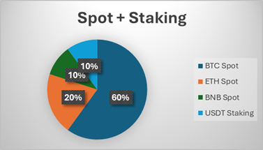 In this example, we allocate 60% capital to BTC spot trading, 20% to ETH, 10% to BNB, and 10% to USDT staking. These allocations are not fixed—you might consider rebalancing 30–40% to your BTC position if market conditions shift, such as ETH outperforming BTC. Regularly reviewing your portfolio is important to ensure your allocations remain aligned with asset performance.